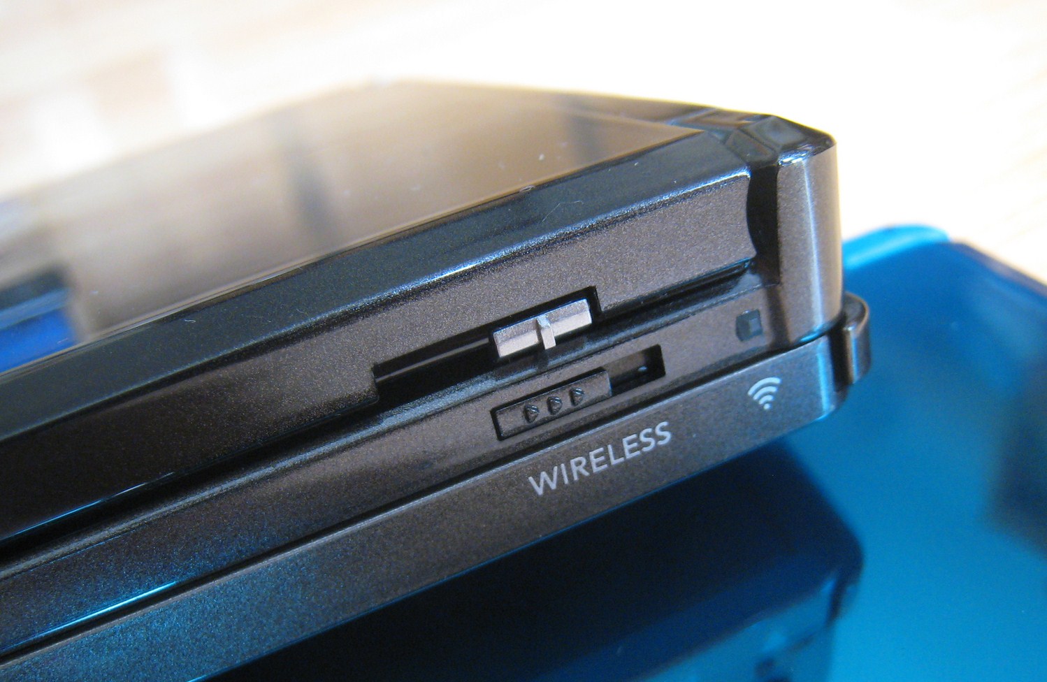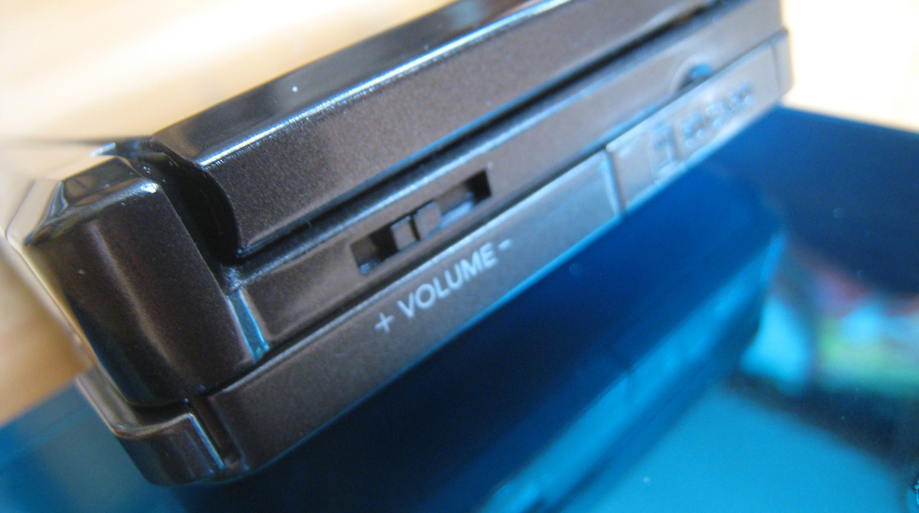 Sur la partie gauche, nous retrouvons la molette pour le réglage du volume! Disparue à partir de la DSi, je suis bien content de la retrouver! je trouve cela plus pratique. Nous avons également le port SD Card, avec le même système que sur la DSi, mais cette fois la carte est fournie dans la boîte. C’est une 2Go de marque Toshiba.