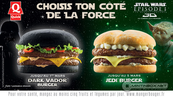 Nous connaissions bien la série Star Wars, ainsi que tous les produits dérivés ayant pour but d’assouvir la passion de tous ces aficionados de l’oeuvre de Georges Lucas. Et bien en 2012, Quick va nous offrir 3 déclinaisons spéciales avec un burger assez inédit, car complètement noir! Serait ce un burger cramé? Un abus de colorant? C’est sur que ce n’est pas très sexy visuellement, mais je trouve que Quick fait fort dans l’originalité! (même si le burger Yoda n’est pas vert…) En tout cas, je prendrai le risque d’y goûter! Sinon pour assouvir votre curiosité, cette campagne Star Wars va être lancée à l’occasion de la sortie de l’épisode 1 au cinéma en 3D!